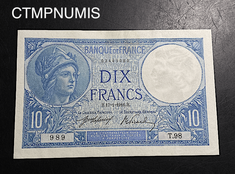 BILLET FRANCAIS 10 FRANCS MINERVE DU 17/01/1916 PETTITE TRACE DE DOIGT SPL+