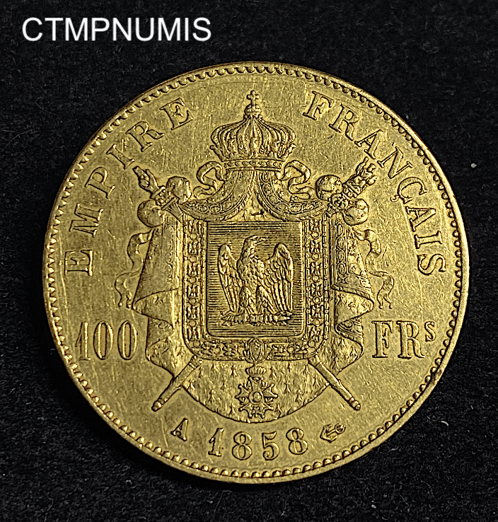 MONNAIE EMPIRE 100 FRANCS OR NAPOLEON III TETE NUE 1858 A PARIS