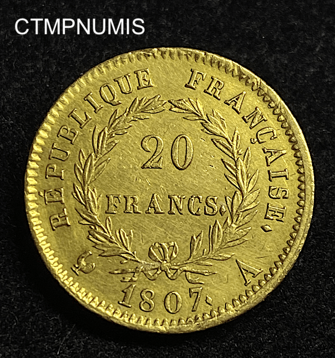 • ,MONNAIE,20,FRANCS,OR,NAPOLEON,TETE,NUE,1807, MONNAIE FRANCAISE 20 FRANCS OR NAPOLEON EMPEREUR REPUBLIQUE 1807 A PARIS BEL ETAT 1,100.00€
