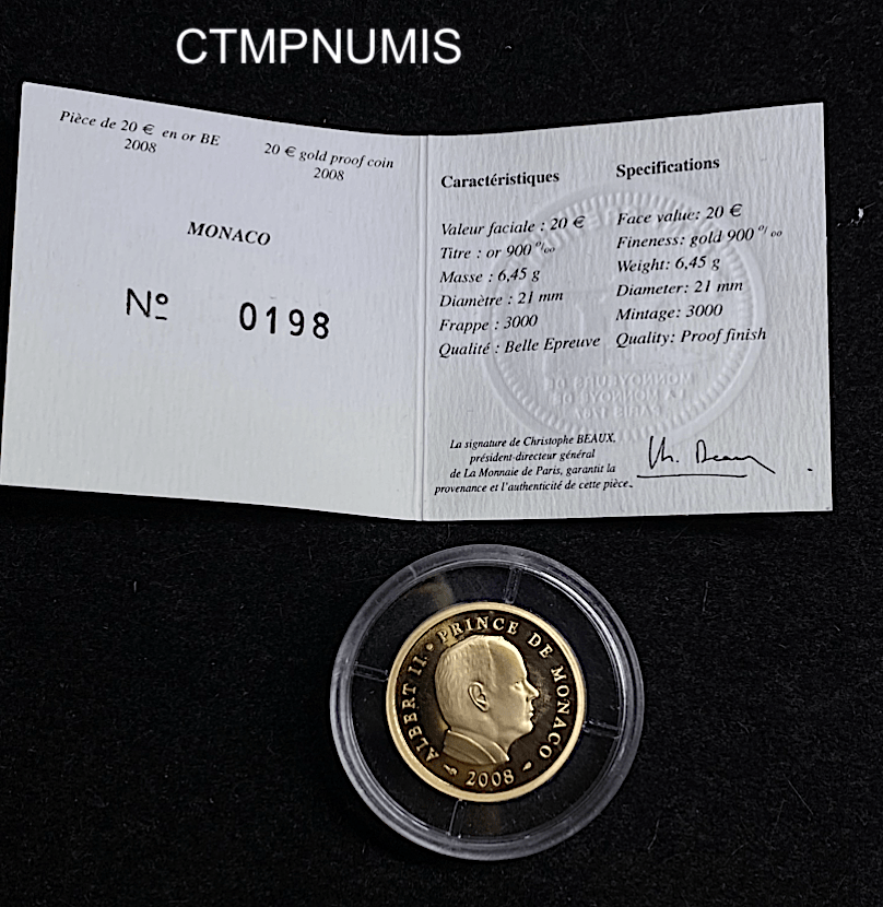 • ,MONNAIE,MONACO,20,FRANCS,OR,ALBERT,II,2008,BE, MONNAIE MONACO 20 FRANCS OR ALBERT II 2008 3000 EX. BE 840.00€