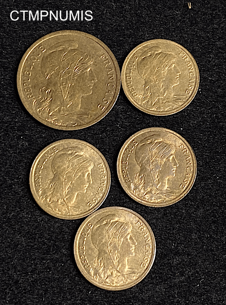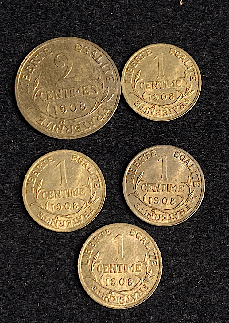 MONNAIE FRANCAISE 1 ET 2 CENTIMES DANIEL DUPUIS 1908 SUP+ LOT DE 5 MONNAIES